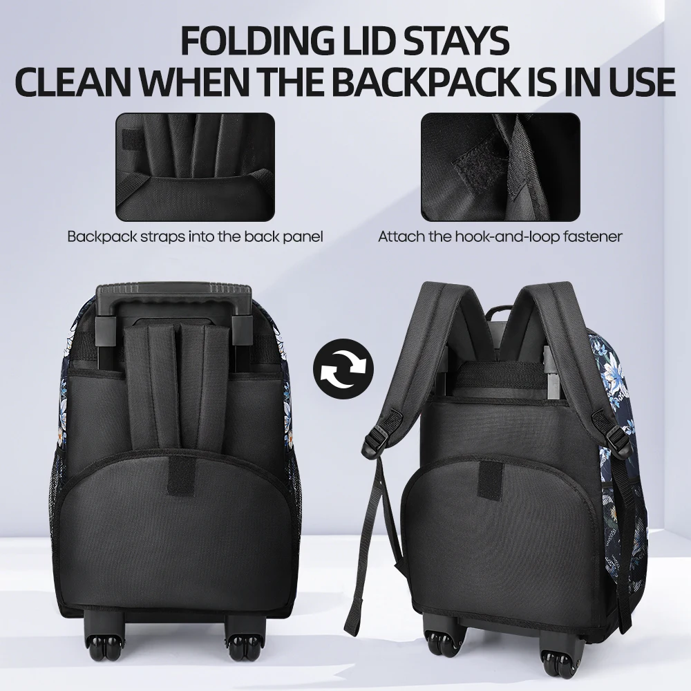 【Large Capacity】Rolling backpacks have a large main compartment for clothes, books, documents, and folders, plus a quick-access front pocket and two side mesh pockets for essentials.